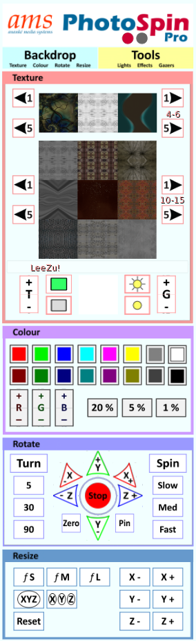 The Backdrop face has all the controls needed to operate the backdrop: Textures, Colour, Rotate, Resize.