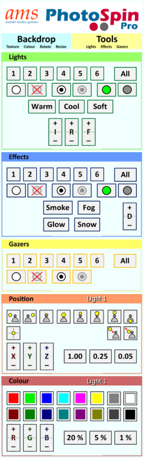 The Tools face has all the controls needed to operate Lights, Effects and Gazers.
