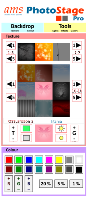 The Backdrop face has all the controls needed to apply Textures and Colours to the backdrop.