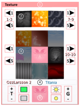 - Use the arrow buttons to cycle through the textures. (The floating number display shows how many textures are available in either direction.)