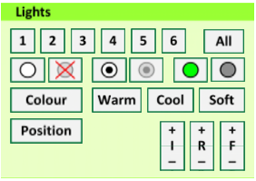 Lights >> – Click this button to access the lights menu. Here you will be able to create and customise lights for your PhotoStage.